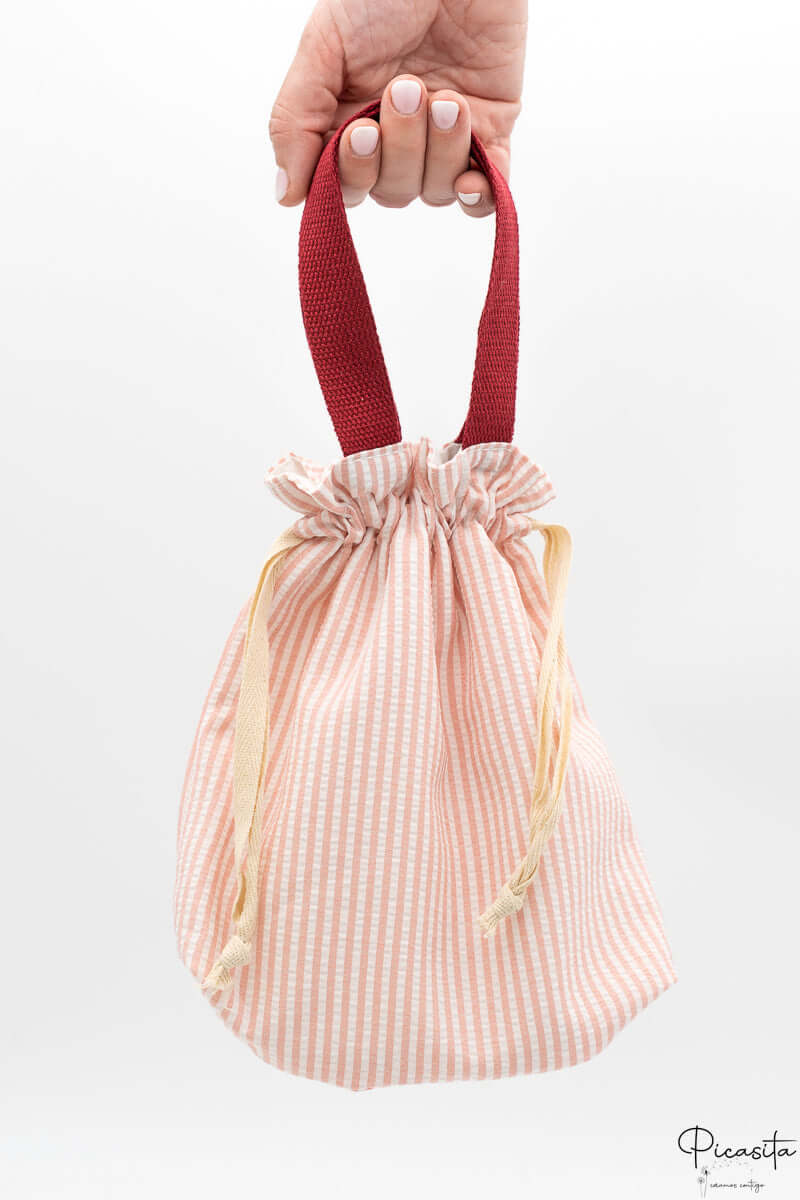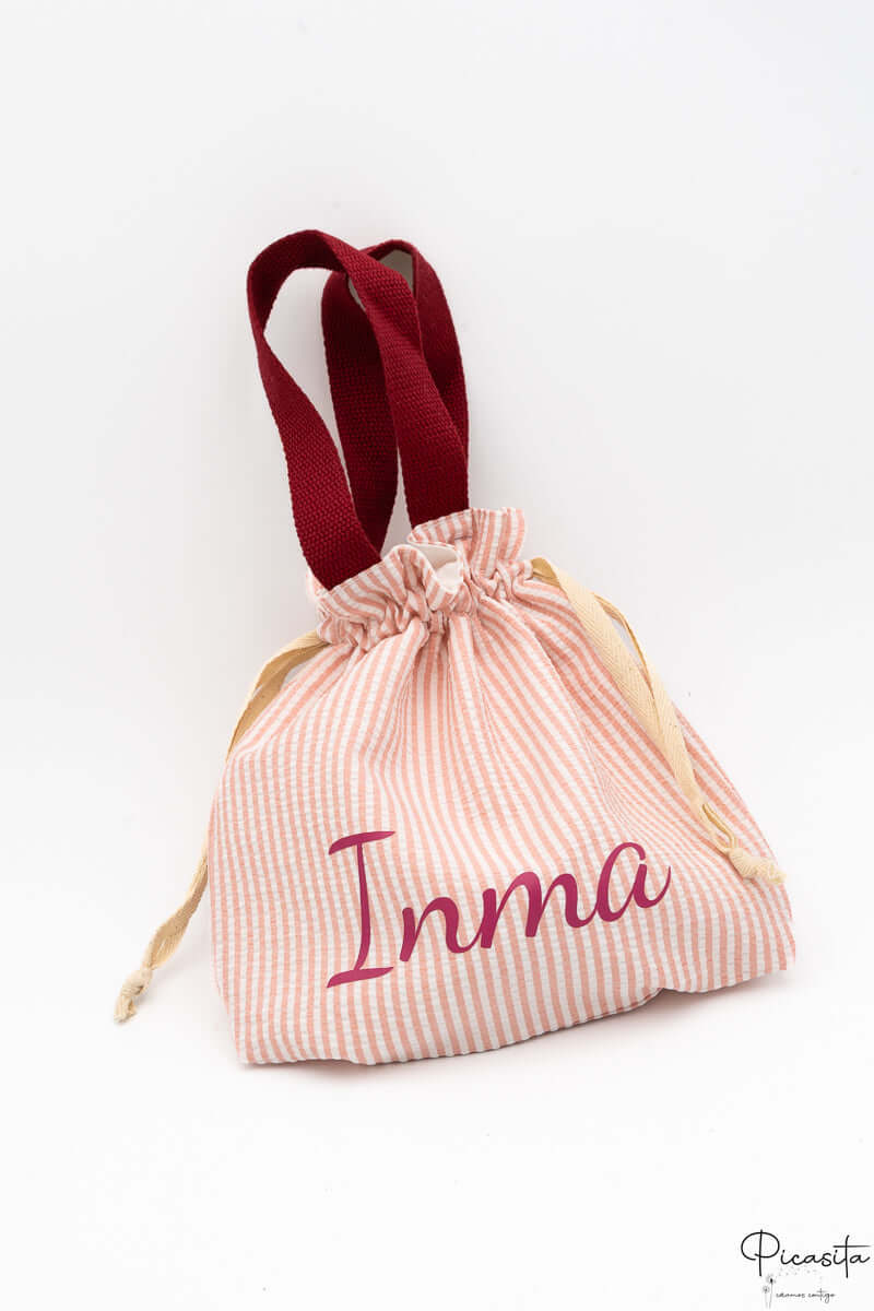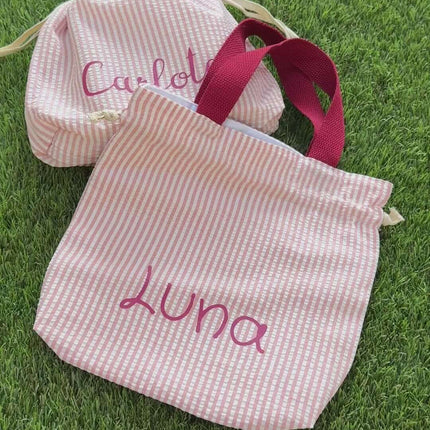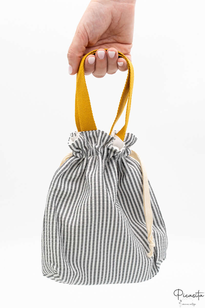 Die Modelle 'Henkel Granatrot' und 'Henkel Senfgelb' haben ein gestreiftes Muster und praktische Canvas-Tragehenkel. Das Modell 'Rosa Karo' hat ein Vichy-Muster und ein klassisches Beutelformat mit Kordelzug, jedoch ohne obere Henkel.