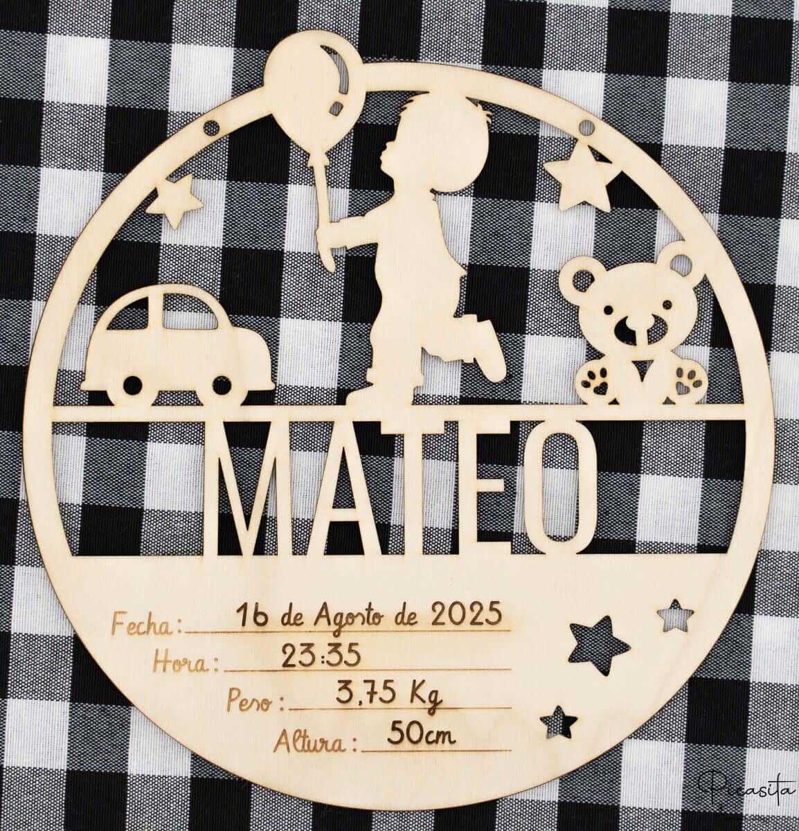 Die Geburt eines Babys ist ein magischer und flüchtiger Moment, der ein Leben lang in Erinnerung bleiben sollte. Mit unserer eleganten Holz-Geburtsanzeige kannst du die Essenz dieses besonderen Tages auf eine visuelle und dekorative Weise festhalten. Diese wunderschöne Geburtsanzeige für Jungen ist sorgfältig gestaltet, um die Geburtsdaten deines kleinen Schatzes zu verewigen und wird zu einem Familienerbstück, das die Zeit überdauert und sein Zimmer mit unvergleichlicher Wärme schmückt. Bei picasita wissen wir, wie wichtig es ist, diese Erinnerungen unversehrt zu bewahren, deshalb bieten wir Stücke voller Bedeutung und Liebe an.