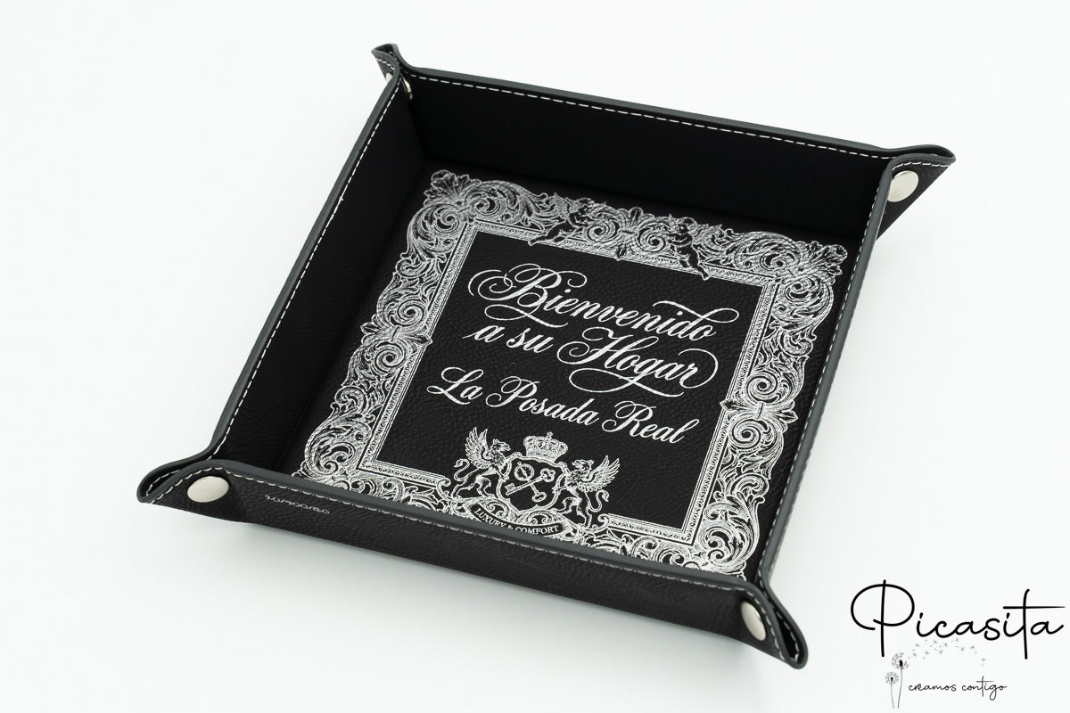 Wir machen jeden Ablageteller für Kleinteile einzigartig. Wir bringen dein Design, Logo oder Text mit einer einfarbigen Personalisierungstechnik auf, die ein elegantes und professionelles Finish garantiert. Ob als Firmenpräsent oder für den persönlichen Gebrauch mit einem motivierenden Spruch („Willkommen zu Hause“, „Deine täglichen Schätze“), das Ergebnis ist klar und langlebig. Dieser valet tray ist nicht nur ein nützliches Objekt, sondern ein Stilbekenntnis.