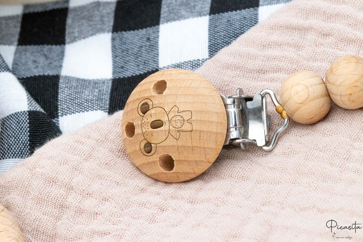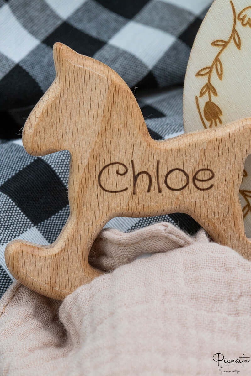 Was unseren personalisierten Babykorb auszeichnet, ist die professionelle und sichere Verarbeitung. Bei Picasita.es verwenden wir hochpräzisen Laser, um den Namen und ein süßes Tiermotiv auf den Holz- und Silikonteilen zu gravieren. Diese Methode verwendet keine Tinten oder Chemikalien; das Ergebnis ist eine einfarbige Gravur in dunkelgrauer Farbe, die dauerhaft und völlig sicher ist, da sie sich durch Gebrauch oder Reinigung niemals abwischen lässt.