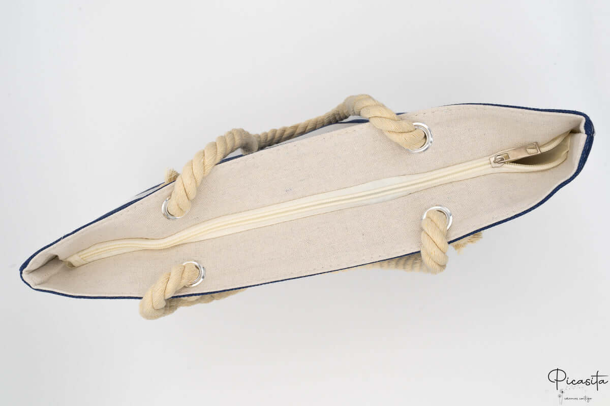 Entwickelt, um den Anforderungen der Strandumgebung standzuhalten, bietet diese personalisierte Strandtasche eine Kombination aus Komfort und Robustheit. Die Griffe, gefertigt aus dickem Segeltau, verleihen nicht nur einen authentischen maritimen Touch, sondern sind auch bequem über der Schulter oder in der Hand zu tragen, selbst wenn die personalisierte Strandtasche voll beladen ist.