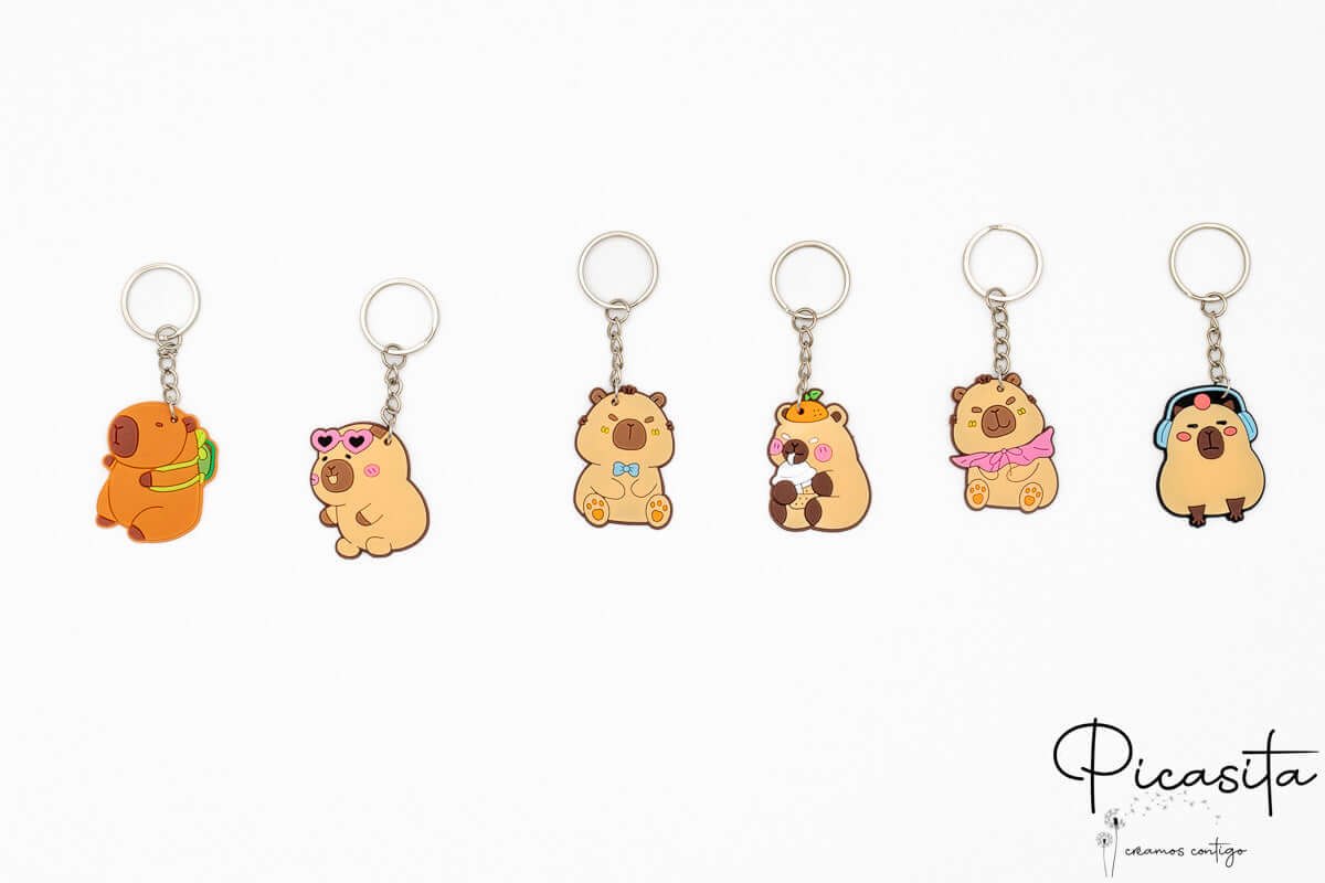 Der Spaß endet nicht mit nur einem Modell. Wir haben eine Kollektion von sechs unwiderstehlichen Varianten: vom sympathischen Capybara mit blauer Fliege bis zu dem, der ein Eis genießt oder mit Kopfhörern Musik hört. Wir laden dich ein, die Website von picasita zu erkunden, um deinen Favoriten zu entdecken und alle zu sammeln. Wenn du dieses lustige Accessoire mit anderen einzigartigen Details kombinieren möchtest, besuche gerne auch unseren vollständigen Katalog, wo du wunderbare, kreative und für jeden besonderen Anlass personalisierbare Optionen findest.