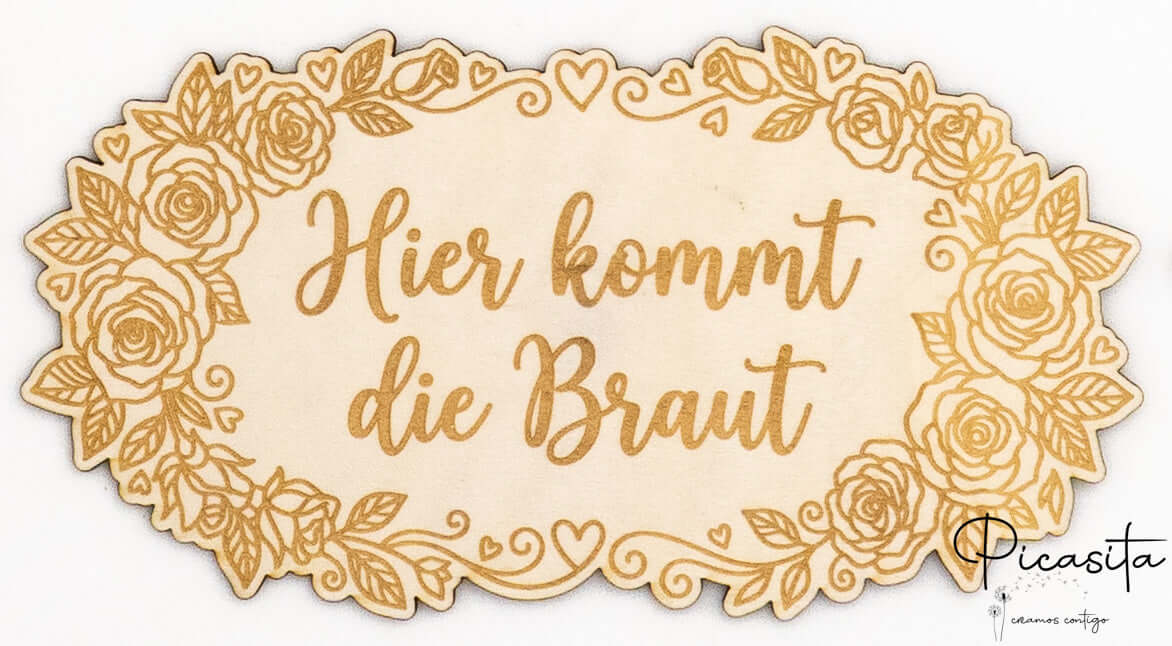 Der Moment, in dem die Musik wechselt und alle Gäste sich zum Gang drehen, ist pure Magie. Um diesen Augenblick noch unvergesslicher zu machen, ist unser exklusives Holzschild die perfekte Ergänzung. Wenn die Kleinsten der Familie stolz verkünden, dass hier kommt die Braut, erfüllt Emotion die Zeremonie. Dieses Schild ist nicht nur ein dekoratives Accessoire, sondern der Auftakt zum „Ja, ich will“, sorgfältig gestaltet, um Lächeln und Freudentränen bei den Gästen hervorzurufen.