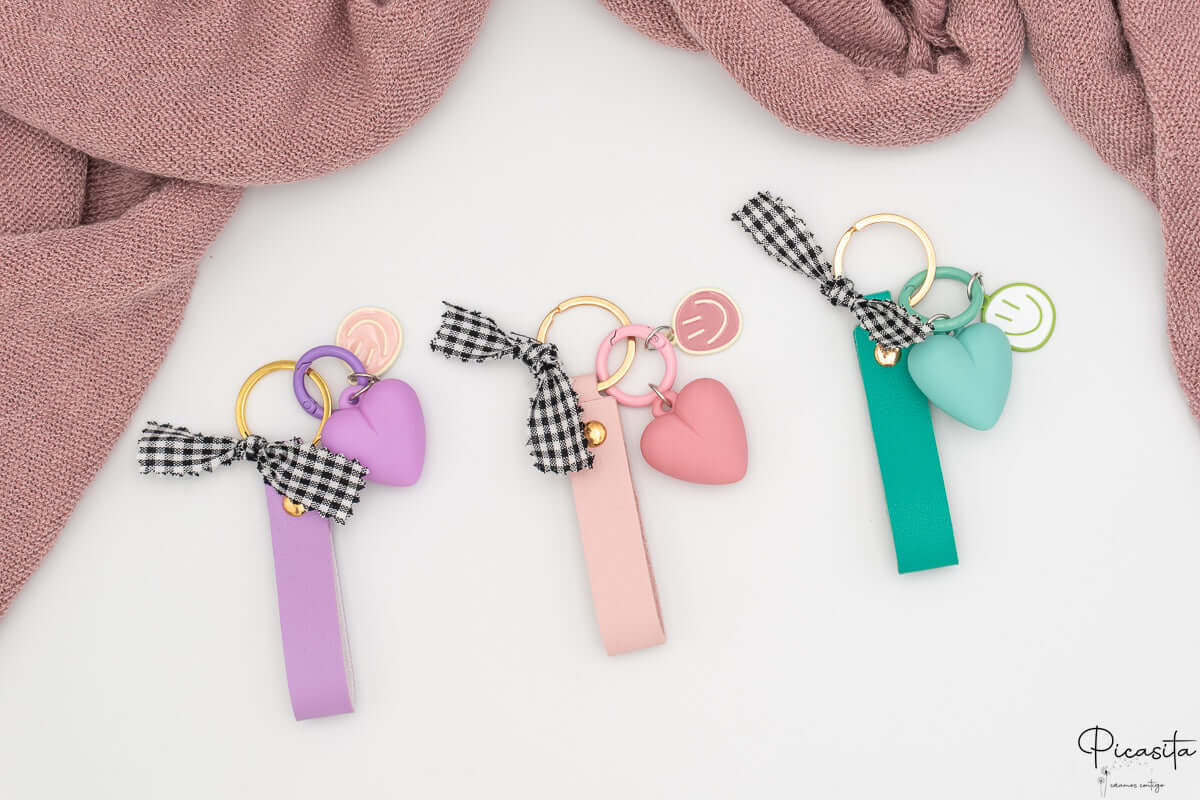 Wir präsentieren unseren fröhlichsten und vielseitigsten Schlüsselanhänger, perfekt für alle, die ihren einzigartigen Stil ausdrücken möchten. Dieses Design verfügt über eine weiche und strapazierfähige PU-Lederband, erhältlich in wunderschönen Pastellfarben, ideal zum Tragen Ihrer Schlüssel oder zum Dekorieren Ihrer Lieblingstasche. Der elegante Ring und der praktische Verschluss in Goldton verleihen einen Hauch von raffinierter Eleganz.
