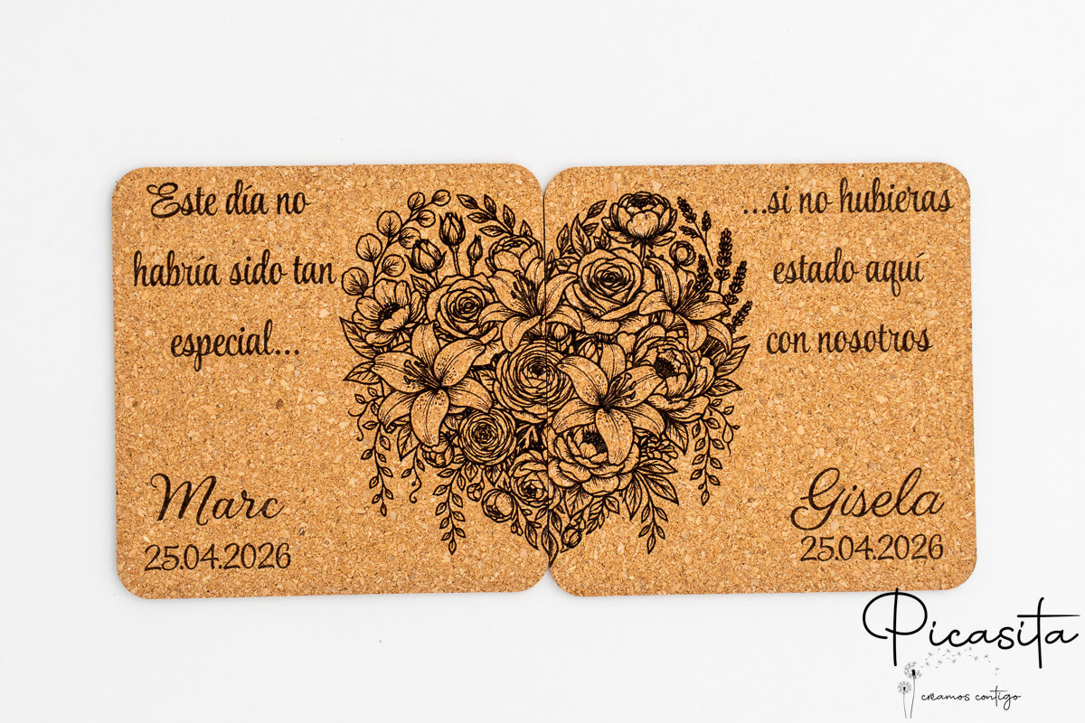 Lo que hace únicos a estos posavasos para invitados de boda es la versatilidad de sus diseños. Contamos con opciones innovadoras como los modelos de corcho diseñados específicamente para parejas: dos mitades que encajan como un puzzle, simbolizando la unión, donde cada miembro de la pareja recibe su parte. Por supuesto, también disponemos de diseños completos e individuales para los asistentes sin pareja, asegurando que este regalo para invitados boda sea inclusivo y pensado para todos. Puedes explorar más opciones en Nuestra Tienda para completar tu pedido.